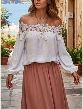 Blusas Elegantes de Encaje Blanco para Mujer Blusa Sexy de Ojal Blusas Casuales de Color Sólido Tops Regulares de Manga Larga Hombros Descubiertos Parte Trasera Sin Espalda Parche de Encaje Ajuste