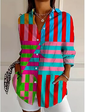 Mujer Camisa de gofres Camisa casual Tops de verano Graphic Abstracto Elegante Vacaciones Vintage Manga Larga Cuello Vuelto Tops regulares Diario Exterior Oficina Blanco Arco Iris Verano Primavera