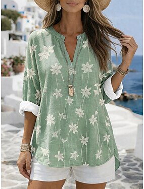 Camisa de lino para mujer tipo lino como algodón inspirada en el lino blusa floral vintage elegante casual blusa de manga corta cuello redondo tops regulares uso diario verde claro verano primavera
