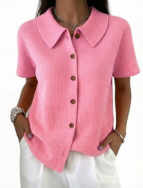 Mujer Camisa de gofres Botones Plano Vintage Elegante Clásico Sin Mangas Manga Corta Cuello Vuelto Cuello Camisero Tops regulares Diario Azul Piscina Negro Blanco Rosa Naranja Verano Primavera
