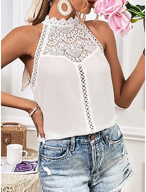 Mujer Tops de verano Blusa Parte superior con ojales Tops de encaje Frunce Encaje Retazos Floral Plano Elegante Vintage damas Sin Mangas Escote en Pico Tops largos Diario Trabajo Festivos Negro Blanco