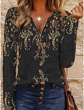Camiseta de Mujer T-Shirt de Cuello Cuarto con Cierre de Manga Larga Casual Gráfico Tribal Vintage Bohemio Tropical Hawaiano de Cuello en V Tops Regulares Diarios Salida Negra Primavera Otoño