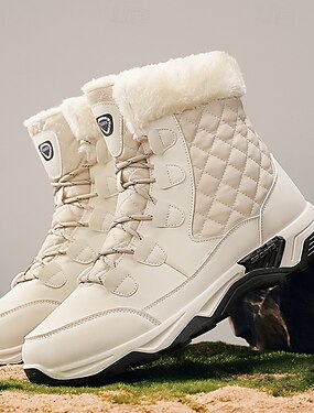 Botas de invierno planas con forro de piel color crema para mujer: cómodas botas de nieve con hebilla y suela antideslizante para climas fríos.