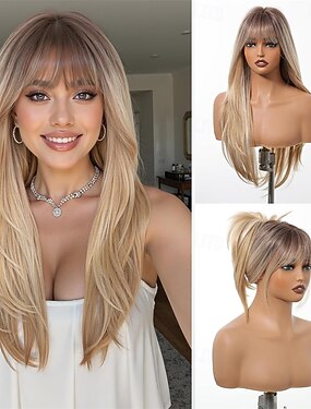 Peluca larga y recta con flequillo, peluca sintética resistente al calor con raíces oscuras, pelucas de aspecto natural para mujeres, peluca de fiesta, cosplay y uso diario.