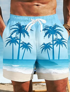 Hombre Árbol de coco Oceano Tropical Pantalones cortos forrados Bañador 2 en 1 Pantalones de Natación Media cintura Hawaiano Vacaciones Ropa de playa Bolsillos laterales con forro de compresión