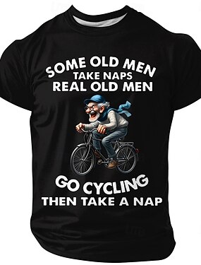 Los hombres mayores de verdad salen a andar en bicicleta y luego toman una siesta. Divertido dibujo animado de un anciano montando en bicicleta. Camiseta de manga corta con cuello redondo, regalo de