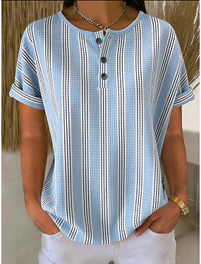 Mujer Tops tejidos con textura Camiseta Bloque de Color Graphic Geometría Elegante Clásico Manga Corta Cuello Barco Escote Redondo Henley Tops largos Diario Deportes Azul Piscina Blanco Verano