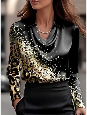 Mujer Camisa Frunce En Cortina Ombre Graphic Geométrico Elegante Básico Casual Manga Larga Cuello vuelto holgado Tops regulares Diario Trabajo Ropa de fiesta de noche En blanco y negro Negro y gris