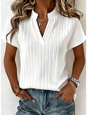 Mujer Camiseta Camiseta superior A Rayas Plano Moda Elegante Clásico Manga Corta Escote en Pico Tops regulares Diario Noche Fin de semana Azul Piscina Verde salvia Blanco Rosa Verde Trébol Verano