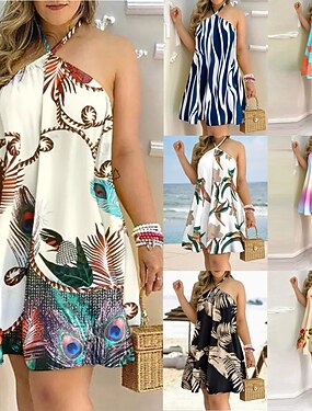 Mujer Mini vestido Vestido informal Vestido de una línea Vestido de cuello halter Moda Diario Vacaciones Noche Ajuste regular Floral Graphic Sin Mangas Cuello halter Azul Piscina Negro Blanco Azul