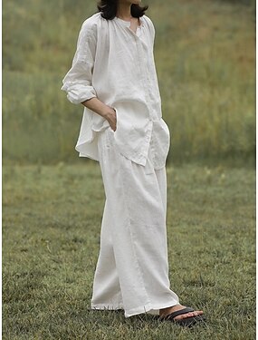 Mujer Camisa Conjuntos de pantalones Lino de algodón sintético Manga Larga Cuello Camisero Color sólido Elegante Vacaciones Vintage Casual Diario Oficina Negro Blanco Verde Ejército Verano Ajuste