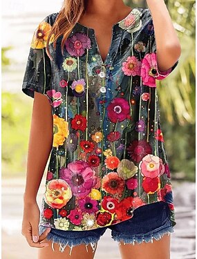 Mujer Camiseta Floral Graphic Plantas Elegante Clásico Manga Corta Escote en Pico Tops regulares Casual Diario Azul Piscina Negro Blanco Naranja Verano Primavera