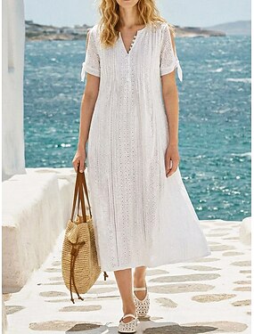 Mujer Vestido Midi Lino de algodón sintético Vestido de cambio Vestido blanco Vestido de algodón blanco Casual Vacaciones Holgado Plano Manga Corta Escote en Pico Blanco Amarillo Verde Trébol Verano