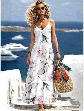 Mujer Vestido maxi Vestido de verano Vestido de una línea Vestido lencero Vacaciones Casual Boho Playa Ajuste regular Floral Graphic Sin Mangas Escote en Pico Blanco Verano Primavera