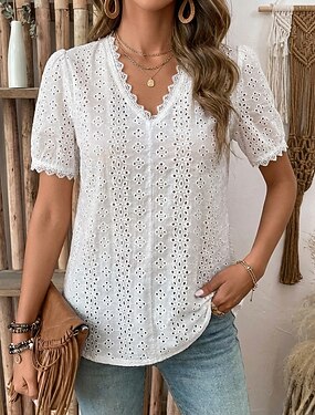 Mujer Camisetas con bordado ojal Color sólido Vintage Elegante Casual Manga Corta Escote en Pico Tops regulares Diario Noche Negro Blanco Azul polvoriento Verano Primavera