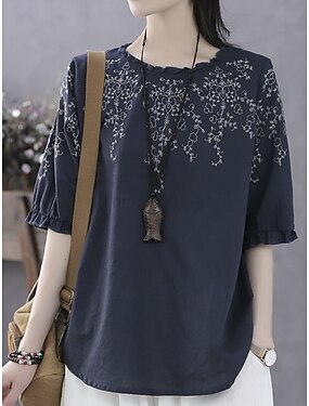 Blusa de lino parecido a algodón para mujer bordado floral casual 3/4 de manga cuello redondo tops regulares diario blanca azul marino verano primavera