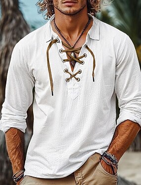 Hombre Camisa Camisa de lino Estilo vikingo Camisa de verano Camisa de playa Color sólido Vacaciones Casual Negro Blanco Verde Trébol Manga Larga Escote en Pico Verano Primavera Ropa Correa