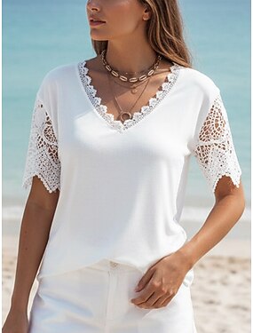 Mujer Camisa Blusa Tops de encaje Retazos Ribete de encaje Plano Clásico Casual Estilo playero Manga Corta Escote en Pico Tops regulares Diario Festivos Noche Blanco Rosa Morado Azul claro Verano