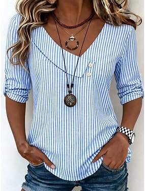 Conjunto de 2 piezas básico neón y brillante camisa blusa lino como manga 3/4 cuello en V estampado a rayas casual gris verano ajuste regular