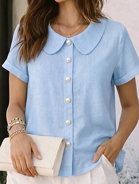 Mujer Camisa Blusa Remera de algodón Botones Color sólido Vintage Clásico Moderno Manga Corta Cuello Camisero Tops regulares Diario Festivos Noche Blanco Amarillo Azul Marino Azul cielo Morado Verano