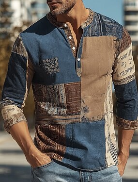 Hombre Geométrico Bloque de color Retazos Camisa Camisa de cuello alto Manga Larga retro de la vendimia Uso Diario Festivos Primavera Otoño Collar mandarín Cuello alto Impresión 3D Camisas con botones