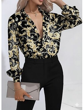 Camiseta de mujer de manga larga geométrica abstracta básica de manga larga cuello apilado escote en V blusas regulares diarias estampado de botones azul royal azul gris primavera otoño invierno