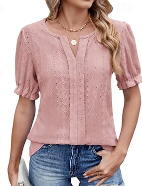 Mujer Blusa Ojal Botones Color sólido Elegante Básico Casual Manga Corta Cuello Barco Tops regulares Diario Rosa Verano Primavera