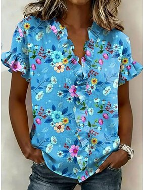 Mujer Algodón Compuesto Blusa Retazos Estampado Graphic Elegante Clásico Moderno Manga Corta Escote en Pico Tops regulares Diario Festivos Noche Blanco Amarillo Azul Oscuro Gris Azul claro Verano
