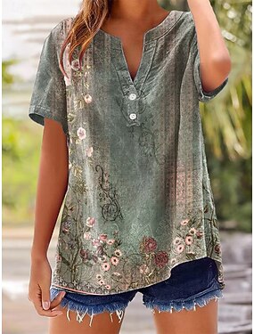 Mujer Camisa Estampado Floral Graphic Vintage Elegante Moderno Manga Corta Escote en Pico Escote Chino Tops regulares Casual Diario Azul Piscina Rosa Morado Verde Trébol Verano Primavera