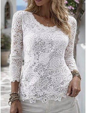 Mujer Blusa Encaje Retazos Color sólido Elegante Básico Casual Manga Larga Cuello Barco Tops regulares Diario Verde Ejército Púrpula Claro Gris Claro Primavera Otoño Invierno