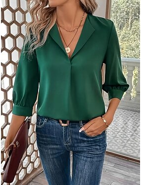 Mujer Blusa Color sólido Elegante Básico Casual Manga 3/4 Cuello Camisero Tops regulares Oficina Trabajo Negro Vino Verde Trébol Verano Primavera Otoño