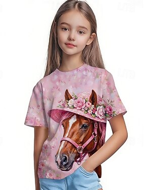 Derby de Kentucky Chica 3D Graphic Caballo Camiseta Manga Corta Impresión 3D Verano Primavera Deportes Moda Ropa de calle Niños 4-12 años Cuello Barco Casual Diario Exterior Ajuste regular