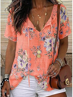 Mujer Blusa Tops de gasa Tops de encaje Encaje Floral Elegante Moderno Manga Corta Escote en Pico Tops largos Casual Festivos Verano Azul Piscina Blanco Rosa Naranja Verde Trébol Verano Primavera