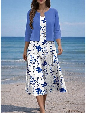 Mujer Conjunto de vestido Vestido de una línea Elegante Casual Floral Graphic Multi capa Estampado Vestido Midi Media Manga Escote en Pico Diario Azul Piscina Amarillo Morado Verano Primavera Ajuste