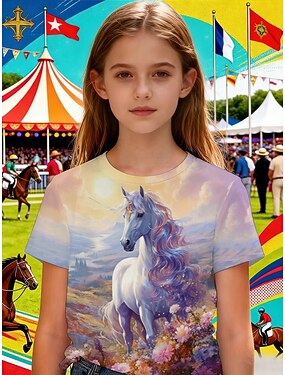 Chica 3D Graphic Caballo Camiseta Manga Corta Impresión 3D Verano Primavera Deportes Moda Ropa de calle Niños 4-12 años Cuello Barco Casual Diario Exterior Ajuste regular