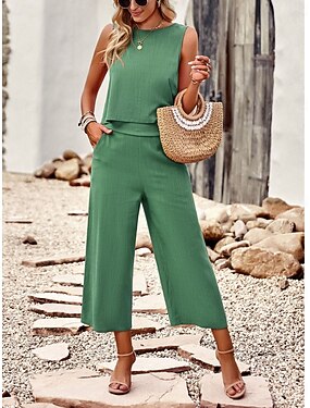 Mujer Conjuntos de pantalones parte superior del bolero Sin Mangas Escote Redondo Color sólido Moda Ropa de calle Casual Diario Exterior Negro Verde Trébol Beige Verano Ajuste regular