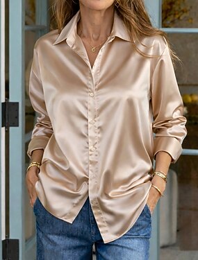 Mujer Camisa Blusa de satén Camisa para Vestido Color sólido Plano Elegante Moda Casual Manga Larga Cuello Vuelto Tops largos Diario Ropa de calle Trabajo Champaña Verano Primavera Otoño