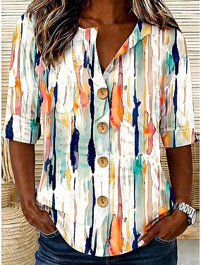 Camisa de señora de manga corta Gráfico geométrico de rayas Vintage Tropical Elegante Cuello Tops largos diarios Blanco Verano Primavera