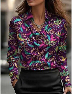 Carnaval Mujer Camisa Estampado En Cortina Graphic Vintage Casual Manga Larga Cuello vuelto holgado Tops regulares Diario Trabajo Festivos Morado Primavera Otoño