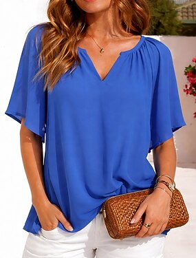 Mujer Camisa Camisa de verano Camisa casual Tops de gasa Frunce Color sólido Plano Elegante Vacaciones Moda Manga Corta Cuello Vuelto Escote en Pico Tops regulares Diario Ropa de calle Festivos Azul