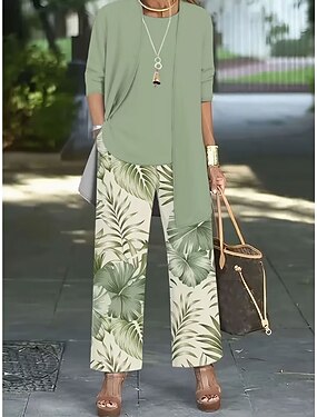 Mujer Conjuntos de pantalones Manga Larga Escote Redondo Graphic Hojas Estampado Moda Ropa de calle Casual Diario Exterior Azul Piscina Morado Verde Trébol Primavera verano Holgado