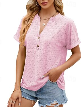 Mujer Blusa con textura Parte superior con ojales Camiseta de punto Camiseta Ojal Color sólido Moda Clásico Casual Manga Corta Escote en Pico Tops regulares Casual Diario Playa Negro Blanco Rosa Azul