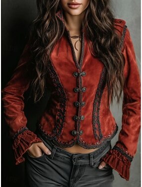 Mujer Camisa Terciopelo Camisa casual Camisa con volantes Plano Vintage Elegante Clásico Manga Larga Collar mandarín Tops regulares Diario Festivos Noche Rojo Primavera Otoño