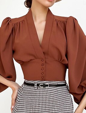Mujer Camisa casual Abotonar la camisa Blusa Sayo Botones Color sólido Elegante Vintage Manga Larga Manga de la linterna Escote en Pico Tops regulares Diario Festivos Noche Negro Blanco Rojo Marrón