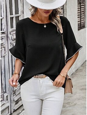 Mujer Blusa Volante Color sólido Elegante Casual Manga 3/4 Cuello Barco Tops regulares Diario Negro Verano Primavera Otoño