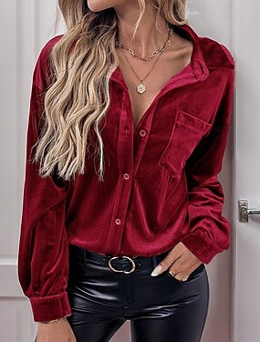 Mujer Camisa Blusa Botones Plano Elegante Manga Larga Cuello Camisero Tops regulares Festivos Noche Rojo Azul Real Marrón Verde Trébol Primavera Otoño Invierno