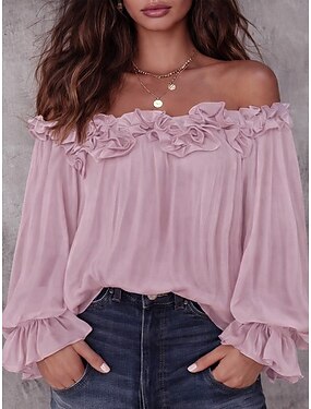 Mujer Camisa casual Blusa Tops de gasa Volante Color sólido Vacaciones Elegante Casual Manga Larga Hombros Caídos Tops regulares Diario Fiesta Festivos Rosa Verano Primavera