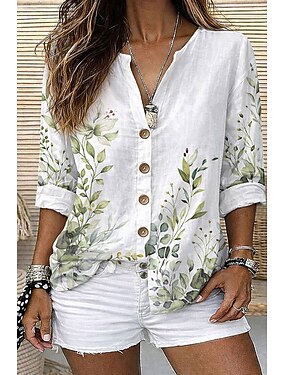Mujer Camisa Estampado Graphic Hoja Elegante Vintage Tropical Media Manga Escote en Pico Tops regulares Diario Festivos Ropa de playa Azul Piscina Rosa Morado Verde Trébol Verano Primavera
