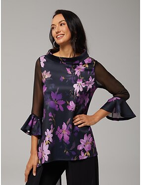 Blusa de mujer con estampado floral morado, mangas de gasa elástica, escote barco, informal, cómoda, para primavera, verano, otoño y vacaciones.