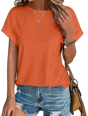 Mujer Blusa con textura Parte superior con ojales Camiseta de punto Camiseta Color sólido Moda Clásico Casual Manga Corta Cuello Barco Tops regulares Casual Diario Playa Azul Piscina Negro Blanco